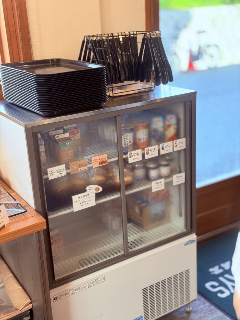 冷蔵コーナーにシュークリーム「パン屋の柊」、飲み物も販売しています。