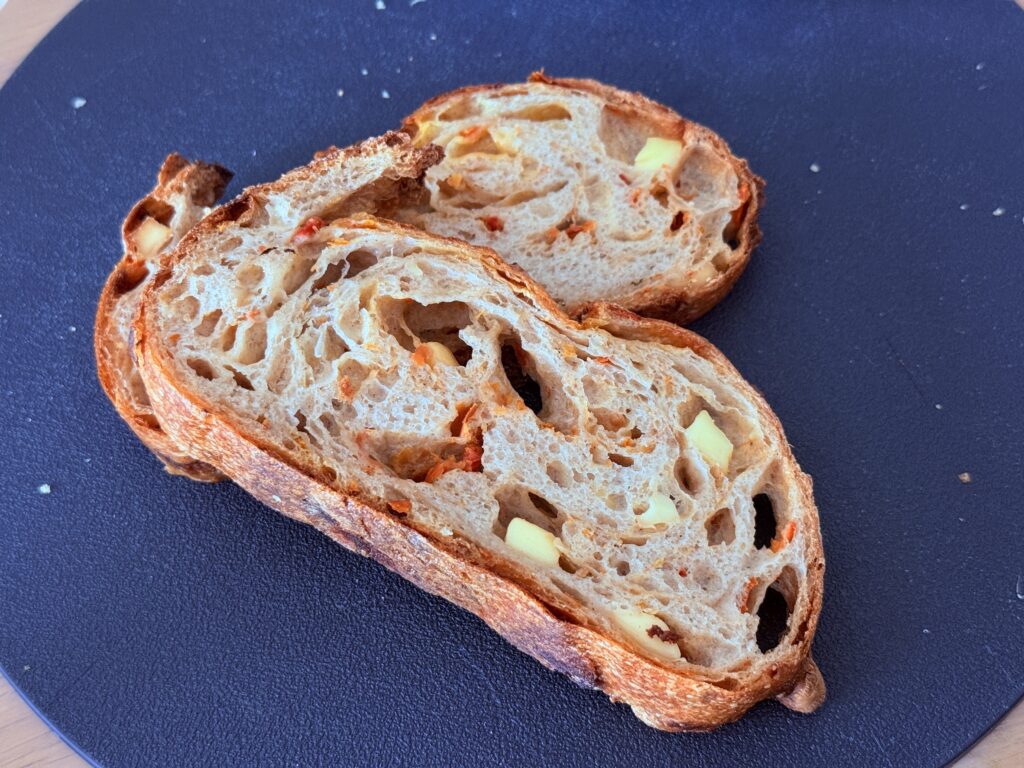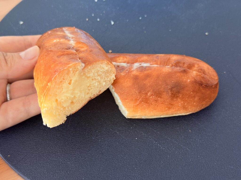 中はふわふわ少しもっちりした感じの生地で、見た目通りドライトマトとチーズが良い組み合わせで、個人的にめっちゃおいしかったです!